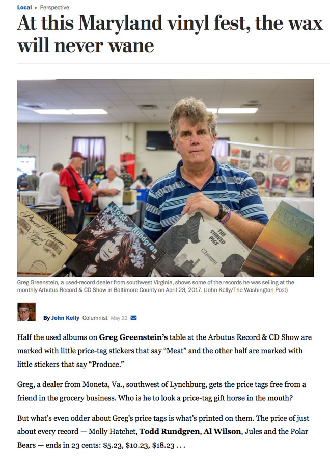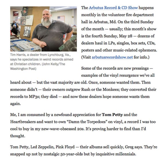 We have two pieces of great news! John Kelly wrote a great feature this week in The Washington Post, “At this Maryland vinyl fest, the wax will never wane” and you can view it here or on our Facebook page. It features two of our vendors Greg Greenstein and Tim Harris (he will be there!) Here are a couple of screen shots.