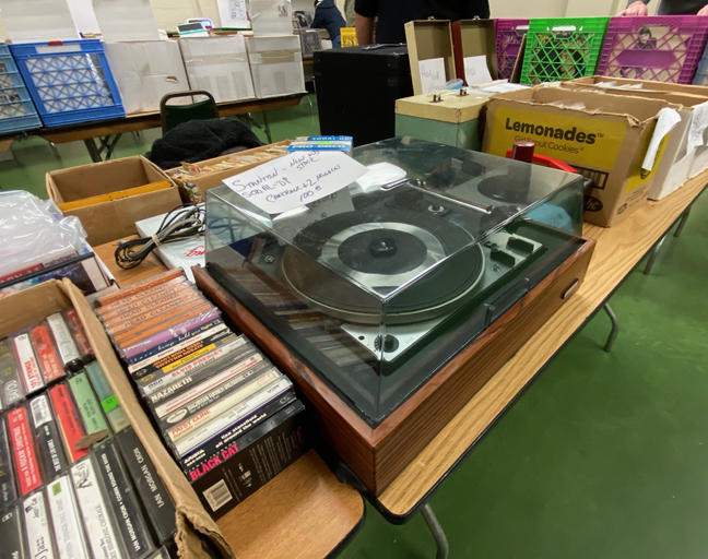 We couldn’t resist a picture of Janet and Frank at last month’s show and that great T-shirt Janet is wearing! Fall is almost, sort of, here, though it doesn’t quite feel like with this Indian summer. But we are back on Sunday, SEPTEMBER 21! So come to the Arbutus Volunteer Fire Department Hall from 9 am – 3 pm. NO admission fee! FREE parking! Celebrate the beginning of fall and football with us with some great music finds. It’s never, never to early to start shopping for the holidays! It was a great crowd at the August show and there were some great finds of all kinds—a vintage radio, vintage record players, T-shirts, figurines, books, and much more!