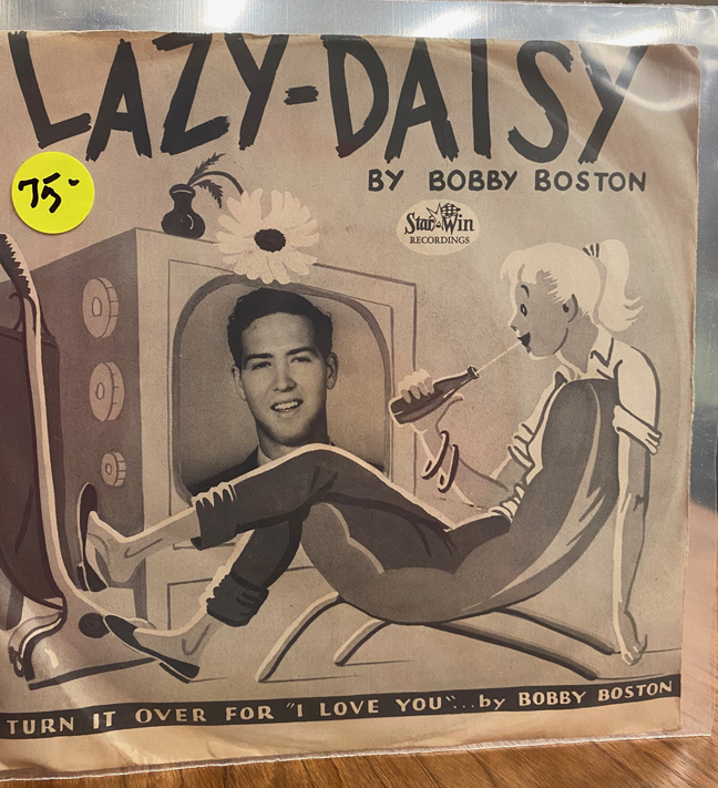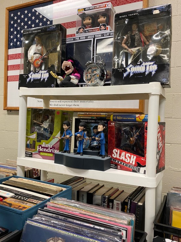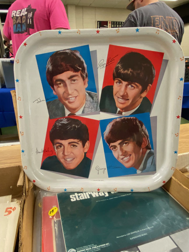 We had a great show last month and Janet was wearing a new Arbutus Record Show T-shirt design by her very talented daughter. Come to the show and you can ask her about the details of how to order one! There were also tons of great finds—even a Beatles shower curtain!