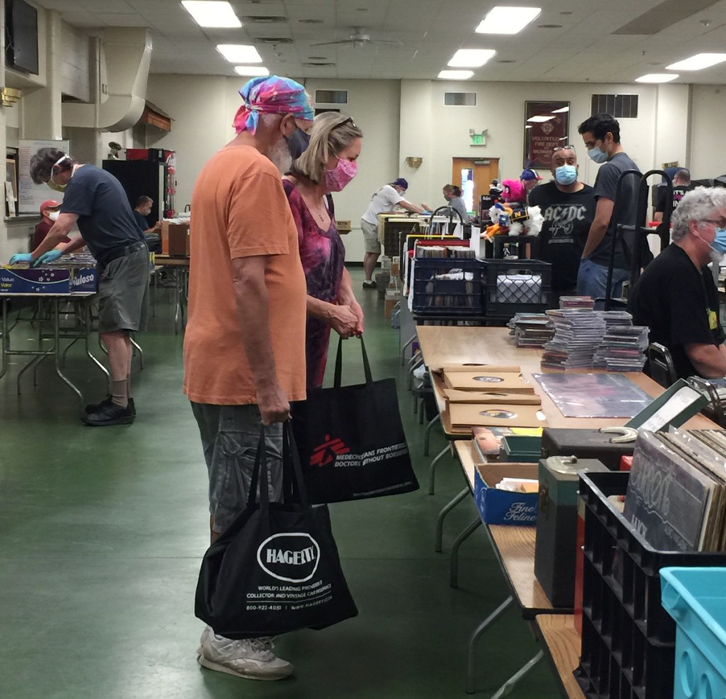 Janet sporting a fun mask and wearing the great record show T (designed by her daughter Patty) at the August show.